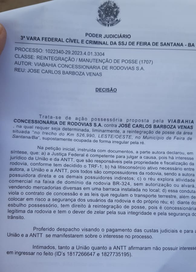 Os comerciantes que operam vendendo alimentos ao longo da BR-324 foram notificados pela Terceira Vara Federal sobre a ordem de reintegração de posse. O mandato determina que devem devolver o espaço à Via Bahia, concessionária que detém a posse, no prazo de 30 dias.
